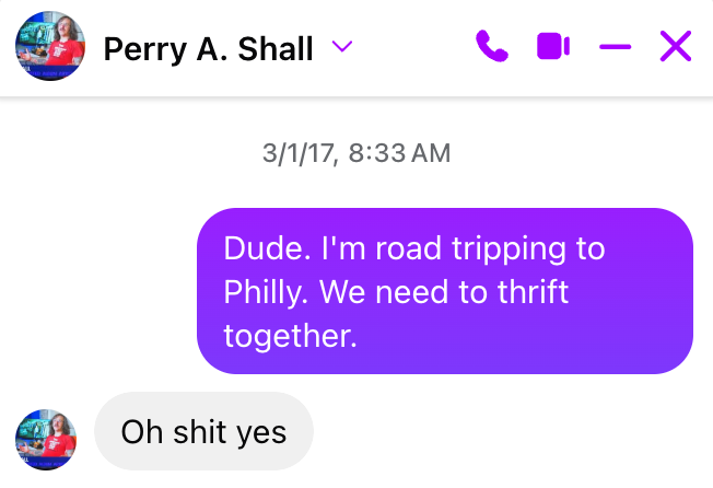 Perry must have mentioned in one of his appearances that he had been featured in a short doc about his vintage t-shirt collection. I watched the video and instantly felt a kindred connection with this combination Wayne-Garth: his passion for thrifting, his OCD in neatly folding, his OCD in checking every shirt on the rack (and his experience of “thrifter’s elbow” that ensues), his fantasy of being buried with his thousands of tees… in Perry, I saw a far-cooler, fully-tatted, Phillyfied version of myself. And when I found out he was also MISHPOCHA??? L’chaim!