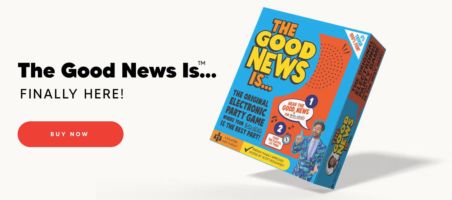 I have a game out! It’s called The Good News Is… and it was produced by Eric Poses at All Things Equal (of Loaded Questions fame). I recorded 200 “good news/bad news” prompts, and it’s up to you to fill-in-the-blanks with an answer, that will either match another player’s answer, or be chosen as the favorite answer of the round. It’s fun for almost the whole family (ages 13+), and if you want to check it out, you can buy it direct (with $5 off, free shipping, and a free puzzle thrown in when you order before September 1st) by clicking right here. Or here. Click anywhere you want, really.