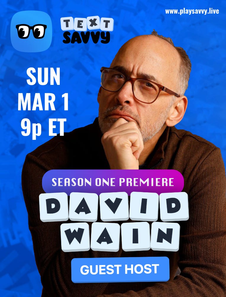 Tonight is the Season One Premiere of TextSavvy — a live, interactive mobile game show of word puzzles airing on school nights (Sunday-Thursday) at 9p Eastern on the Savvy app.
