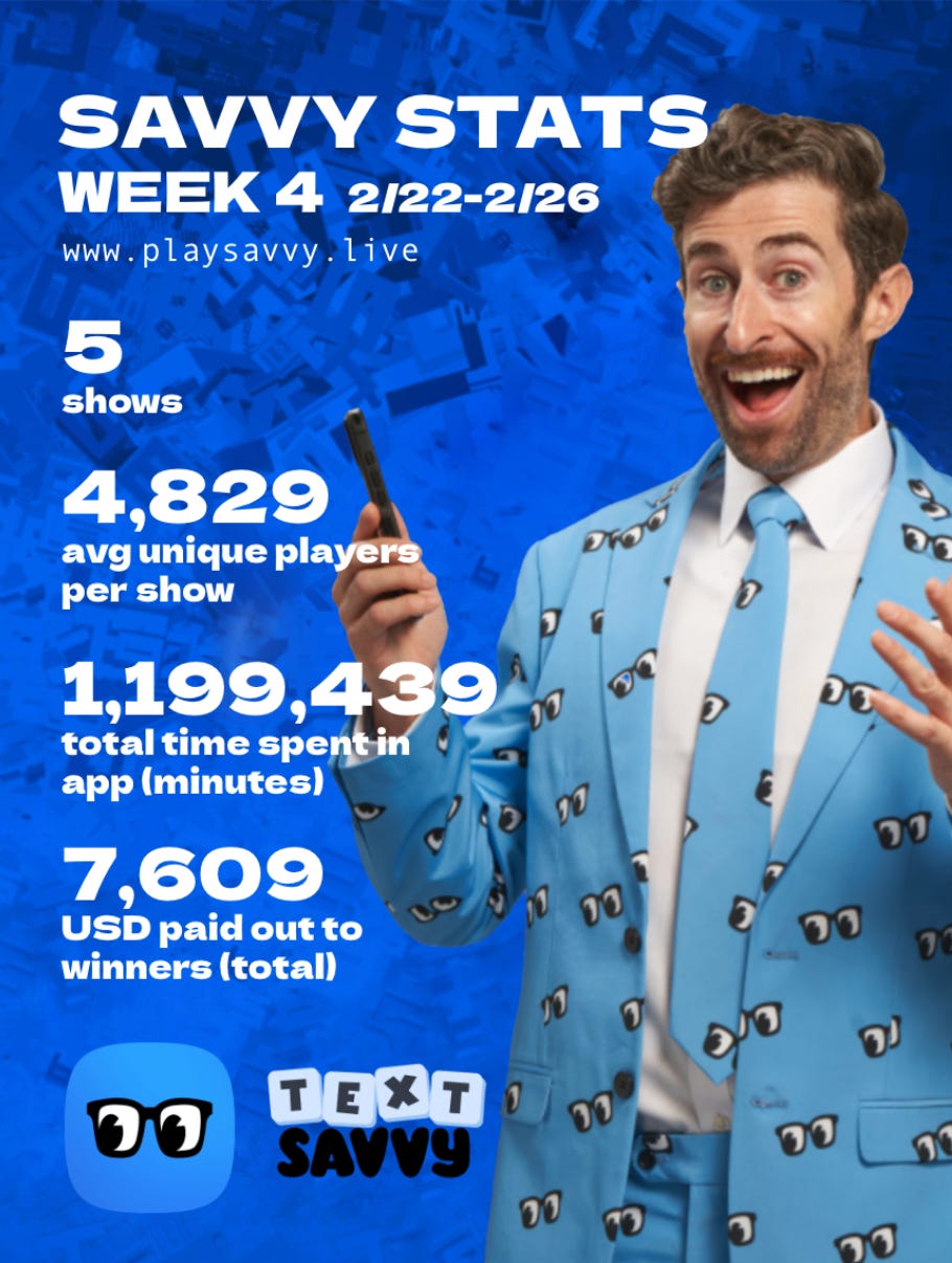 What does all of this mean for you? It means you can download the Savvy app and not merely watch our Wordle-inspired game show — but actively participate in it as a real-time contestant.