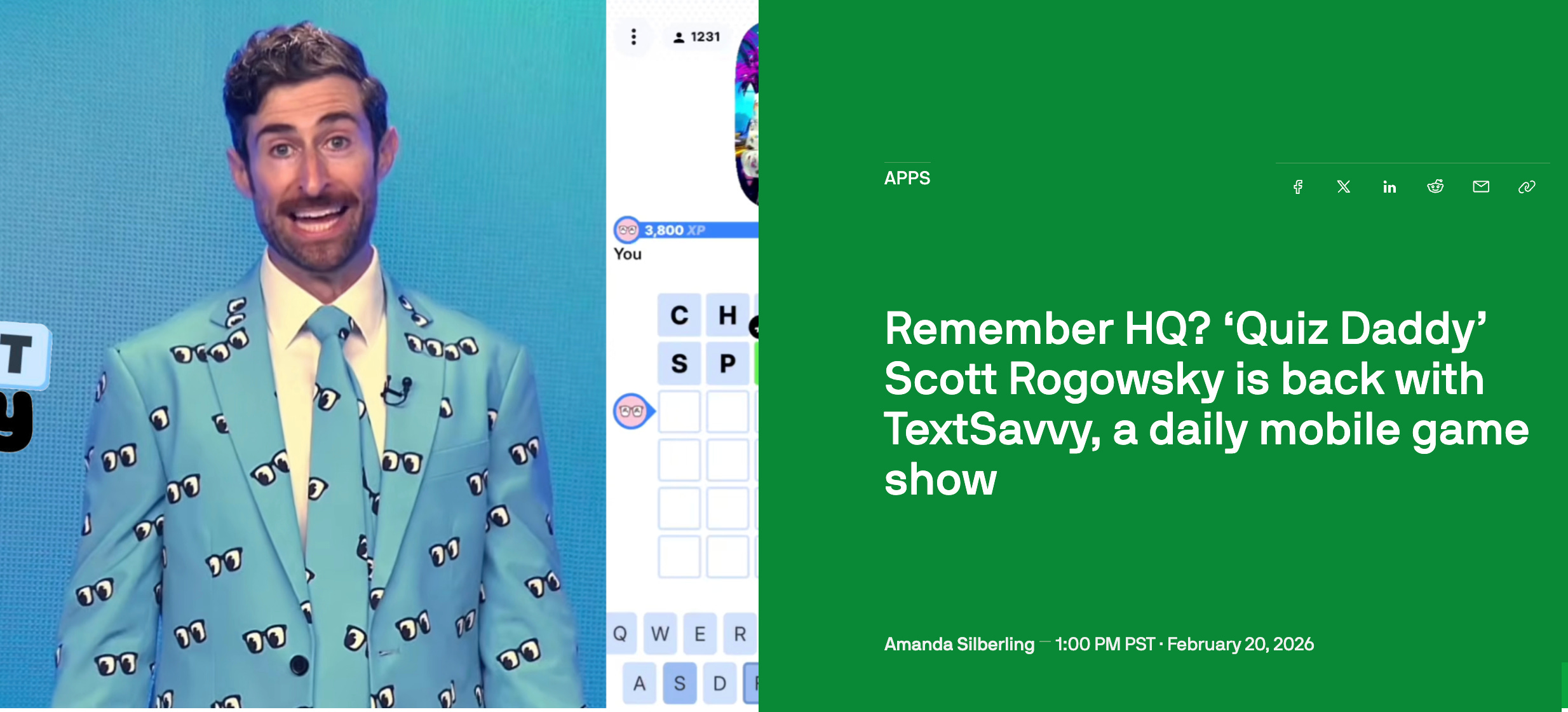 I’m a co-founder of the app — which we can confidently say is the world’s only mobile gaming platform for live-hosted, two-way interactive game shows — and the host of its flagship offering, TextSavvy.1